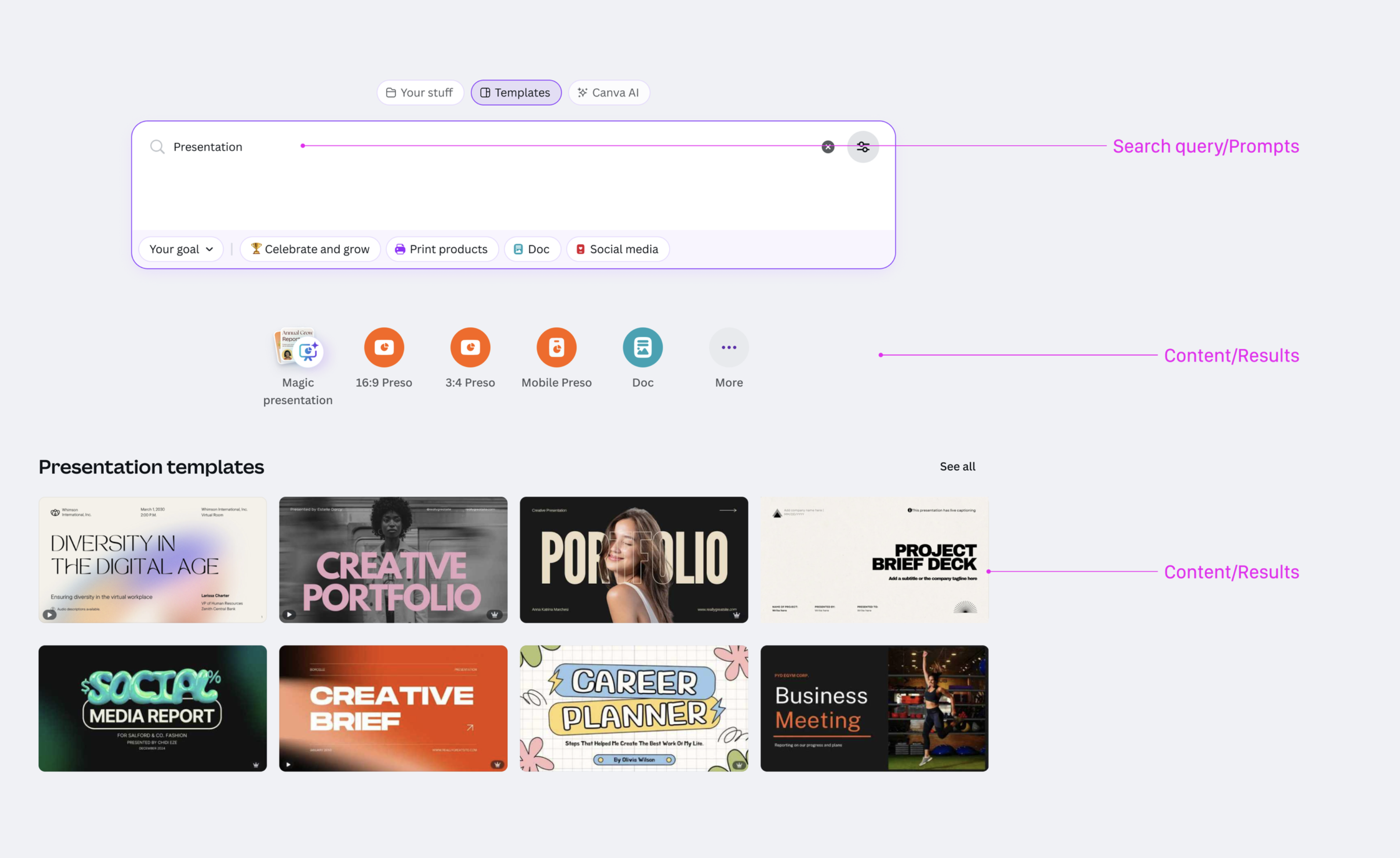 users can type what they want to find or generate templates, designs, images, videos, and docs. all from one location.
