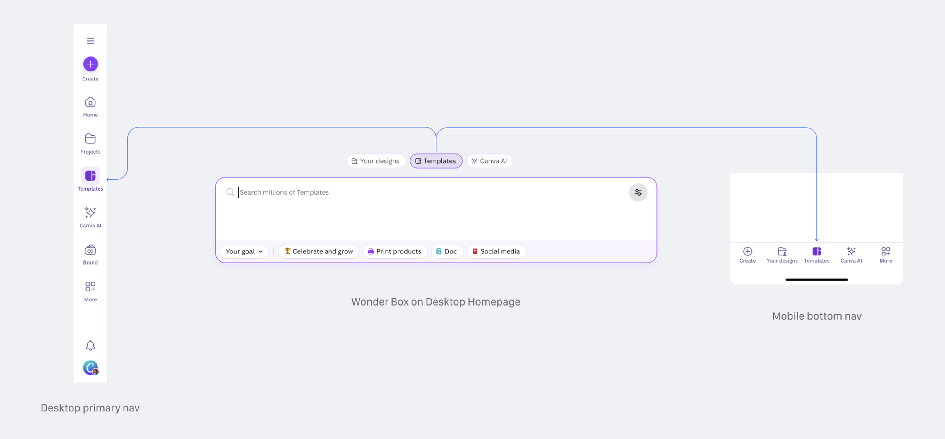 wonder box lives across canva on the homepage, in the editor, and in canva ai. same entry, different contexts.
